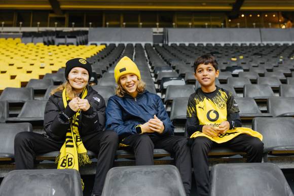 Drei junge Borussia-Dortmund-Fans im Signal Iduna Park – passend zur neuen Xplora X6Play BVB-Edition, die speziell für Kinder entwickelt wurde