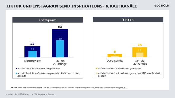 Über die Hälfte (57 Prozent) der Befragten sind über Social Media schon einmal auf ein Produkt aufmerksam geworden. Vorreiter in Sachen Social Shopping ist aktuell Instagram mit 15 Prozent Kaufabschlüssen - doch auch TikTok befindet sich auf der Überholspur: Trotz geringerer Reichweite und Nutzerzahlen liegen die Werte bei der generellen Wahrnehmung von Produktwerbung (25 Prozent) und den tatsächlichen Kaufabschlüssen (12Prozent) bei der jüngeren Zielgruppe bereits nahezu identisch zu den durchschnittlichen Daten bei Instagram.