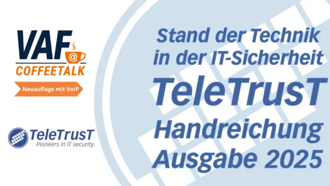 Am 29. Juli informiert der VAF gemeinsam mit TeleTrusT in einem kostenfreien Webinar zur Neuauflage der Handreichung „Stand der Technik in der IT-Sicherheit“. Im Fokus stehen VoIP und Unified Communications.