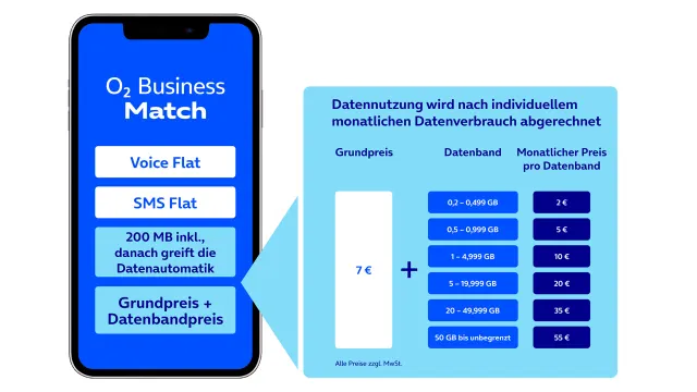 Auf dem Partnertag im Januar hatte der Münchner Netzbetreiber den neuen Tarif O2 Business Match bereits angekündigt, nun geht er an den Start. Das Besondere an dem Tarif: Der Datenverbrauch der Karten wird jeden Monat individuell abgerechnet – dazu kommt noch eine Grundgebühr. Der Tarif enthält insgesamt sieben Datenstaffeln zwischen 0,2 GB und über 50 GB, was Unlimited entspricht. Je nach Datenverbrauch ordnet der Tarif den Nutzer den jeweiligen Staffeln zu. Das geschieht laut O2 Business automatisch. Die Grundgebühr beträgt regulär sieben Euro, zum Start kostet sie 5,50 Euro. Das geringste Datenvolumen von 0,2 GB ist bereits im Basispreis enthalten. Wer mehr als 50 GB verbraucht, landet automatisch in der Datenstaffel mit unbegrenztem Datenvolumen und zahlt dann maximal 44 Euro. Eine Voice- sowie eine SMS-Flat sind ebenfalls enthalten.