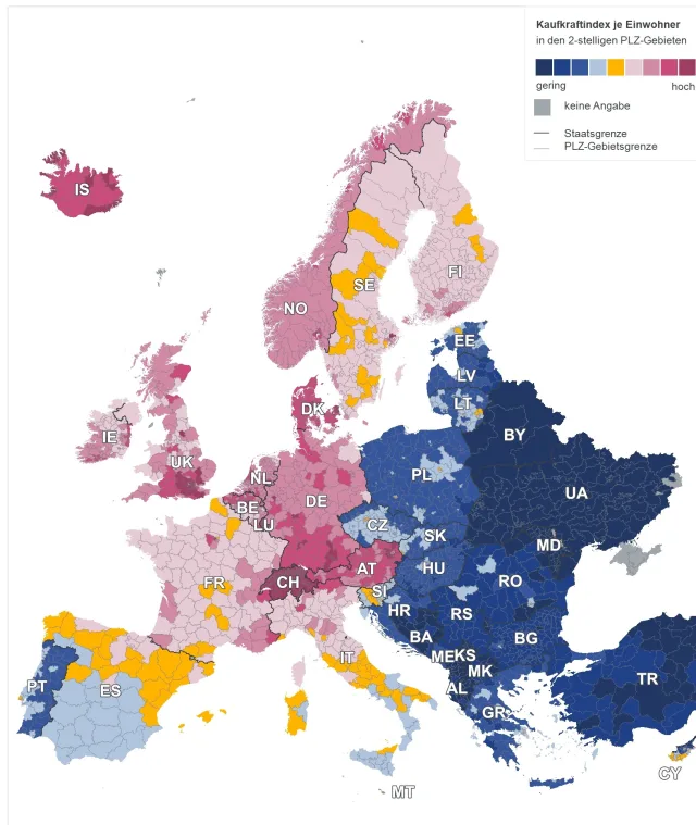 Die Kaufkraft ist in Deutschland, der Schweiz und Skandinavien besonders hoch, während Osteuropa deutlich darunterliegt