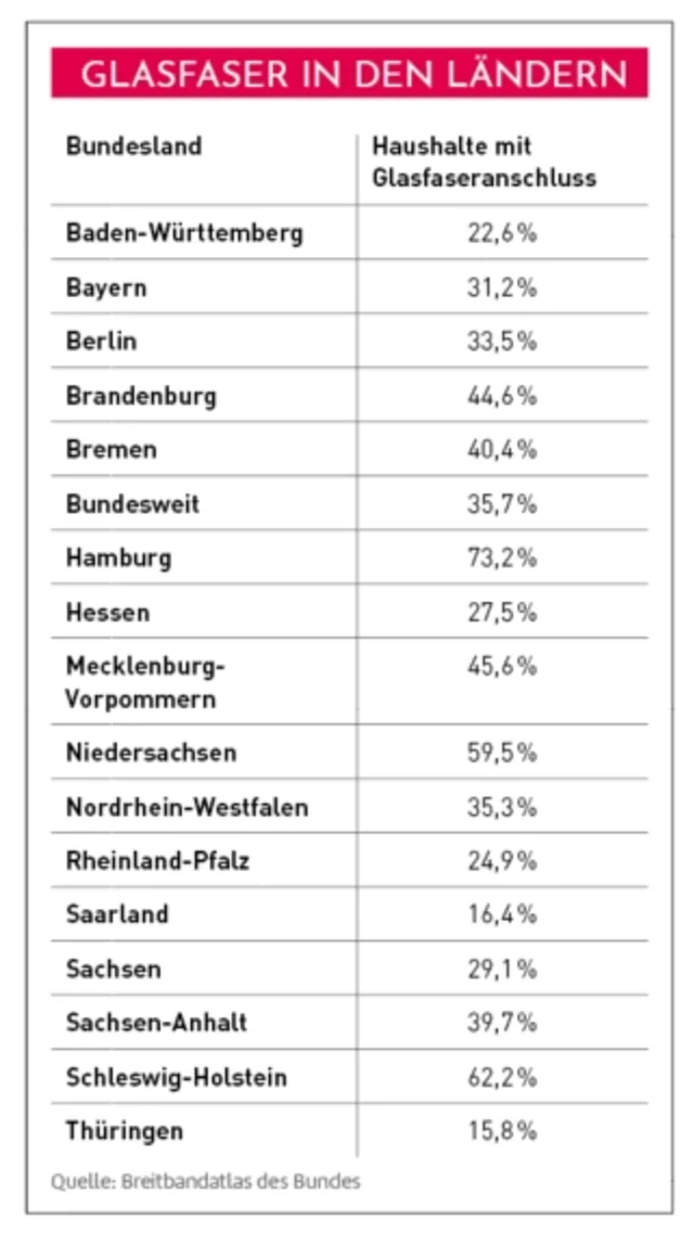 Der Großteil der Haushalte ohne Glasfaserversorgung liegt in städtischen (15,1 Millionen oder 64,1 Prozent der Haushalte) und halbstädtischen Gemeinden (8,9 Millionen oder 63,8 Prozent). In ländlichen Gebieten sind noch 2,9 Millionen unversorgt, das entspricht 66,7 Prozent aller dortigen Haushalte. Regional zeigt sich das Bild sehr heterogen: Auch wenn vor allem der Norden und Nordwesten Deutschlands besser versorgt sind, gibt es auch dort Ausnahmen. Im Süden, Südwesten und Osten der Republik gibt es aber mehr Lücken. Spitzenreiter ist Hamburg mit über 73 Prozent versorgten Haushalten vor Schleswig-Holstein mit 62 Prozent. Ganz hinten liegen Thüringen und das Saarland mit jeweils rund 16 Prozent.
