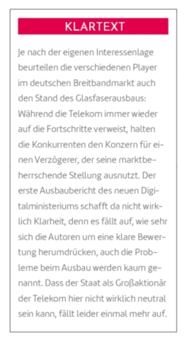 Die Konkurrenten der Telekom reagierten auf den Bericht: So heißt es in einem gemeinsamen Statement der Geschäftsführer der Verbände ANGA und VATM, Philipp Müller und Frederic Ufer: „Der neueste Bericht belegt eindrucksvoll, dass die Telekom als ehemaliger Monopolist deutlich hinter ihren Möglichkeiten zurückbleibt. Millionen Haushalte in Gemeinden, in denen die Telekom ausbaut, werden durch das Unternehmen nicht versorgt, obwohl das Kabel direkt vor der Haustür liegt. Die Wettbewerber hingegen erreichen in ihren Ausbaugebieten durchschnittlich über 75 Prozent der Haushalte und investieren auch dort, wo die Erschließung wirtschaftlich anspruchsvoll ist – im Gegensatz zu bescheidenen 45 Prozent Versorgungsgrad bei der Telekom. Die Versorgung der Verbraucher mit hochleistungsstarker Infrastruktur geschieht also vorrangig durch das Engagement der Wettbewerber im TK-Markt.“