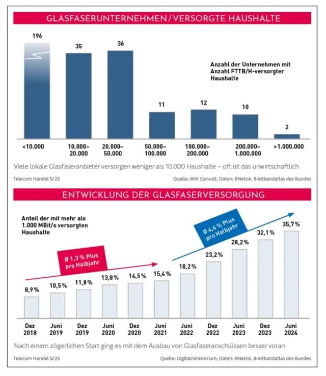 Insgesamt hatten zur Mitte des Jahres 2024 über 300 Telekommunikationsunternehmen eine Glasfaserversorgung an den Breitbandatlas des Bundes gemeldet. Es zeigt sich, dass 196 der insgesamt 302 Unternehmen jeweils weniger als 10.000 Haushalte versorgen und nur einen Anteil von 3,3 Prozent an der Gesamtversorgung haben. Weitere 35 Unternehmen versorgen zwischen 10.000 und 20.000 Haushalte. 36 Unternehmen versorgen mehr als 20.000, aber weniger als 50.000 Haushalte.