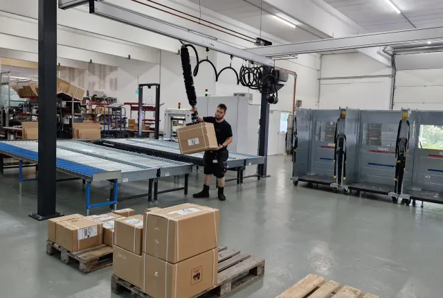 Ein neu eingerichteter Pufferbereich soll helfen, stark schwankende Versandmengen zu bewältigen. Zusätzlich wurden die Arbeitsplätze überarbeitet: höhenverstellbare Packtische, Vakuumheber zur Entlastung und verbesserte Lichtverhältnisse sollen die Arbeitsbedingungen verbessern.